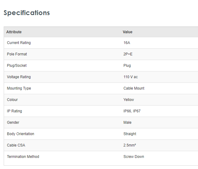 RS Pro 218.163 IP66, IP67 Yellow Cable Mount 2P+E Industrial Power Plug, Rated At 16A, 110 V ac - Brand new item, still in OEM packaging  - Check out the images for more product details Product details Cable mounting free...View more