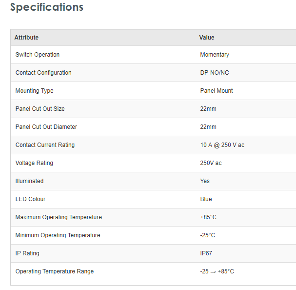 Schurter 1241.6934.1124000 DP-NO/NC Momentary Push Button Switch, IP67, 22mm, Panel Mount Blue LED, 250V ac - Brand new item, still in OEM packaging  - Check out the images for more product details Product details Robust pushbutton switch suitable for use...View more